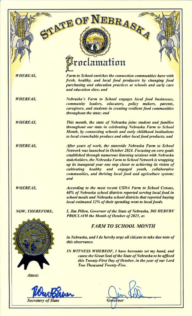 On October 21, 2025, Governor Jim Pillen took a signification step towards fostering healthy communities, improving nutritional quality of school meals, and supporting local agriculture by signing a proclamation to declare October as Farm to School Month in Nebraska. This proclamation highlights the importance of connecting schools with local agricultural producers, enhancing nutrition education, and promoting healthy eating habits among students.