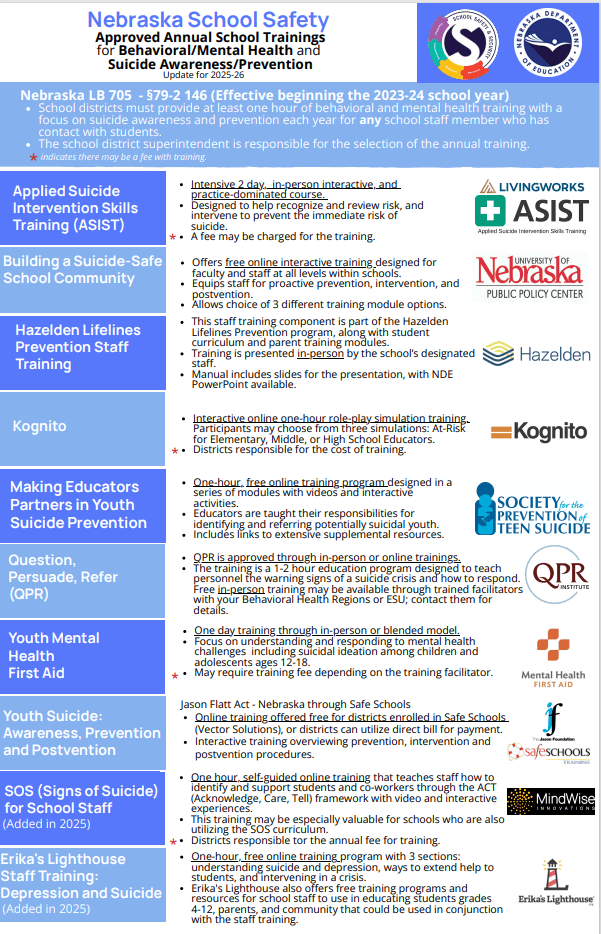 - Overseeing behavioral and mental health training, with a focus on suicide awareness and prevention in public schools pursuant to section 79-2,146; Approved Training List
